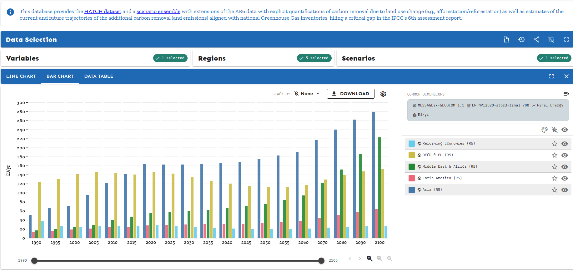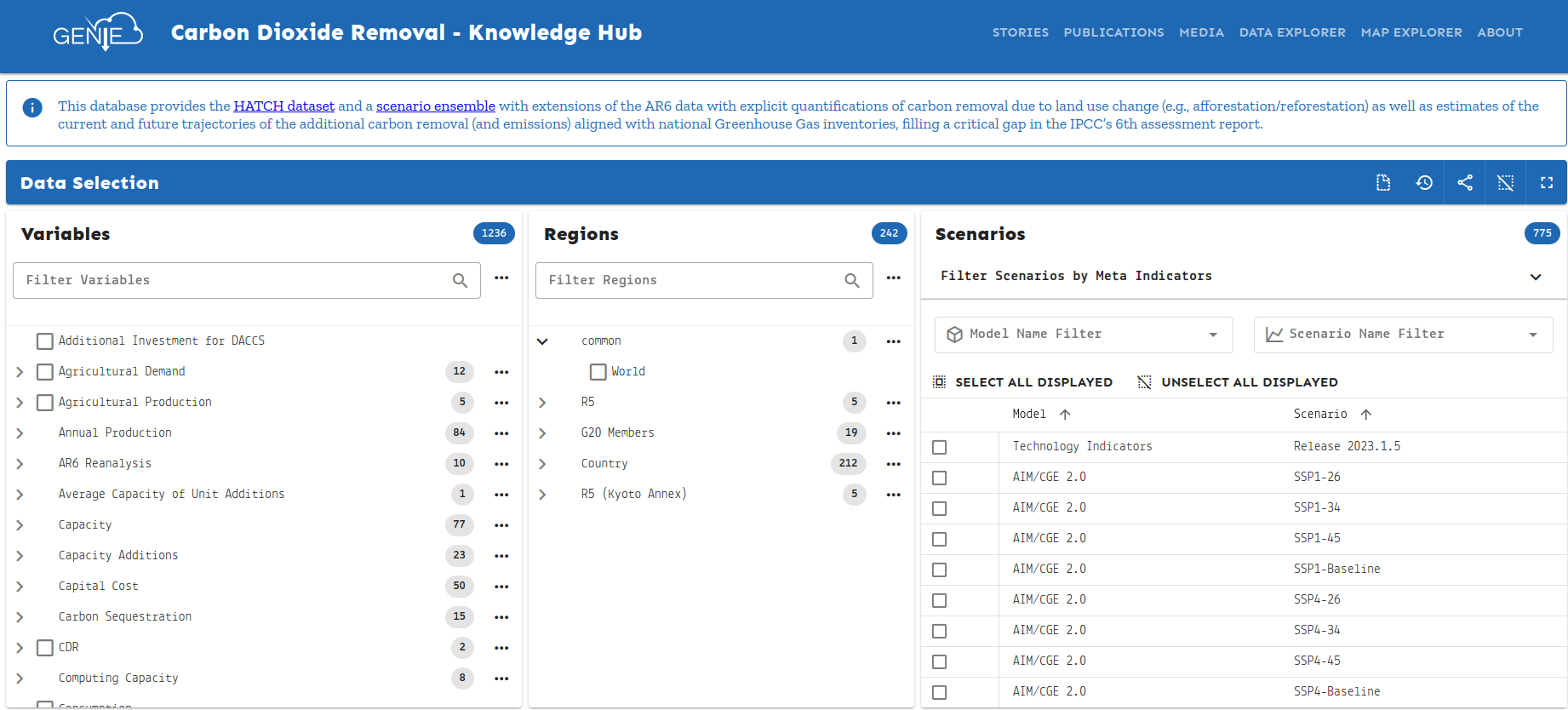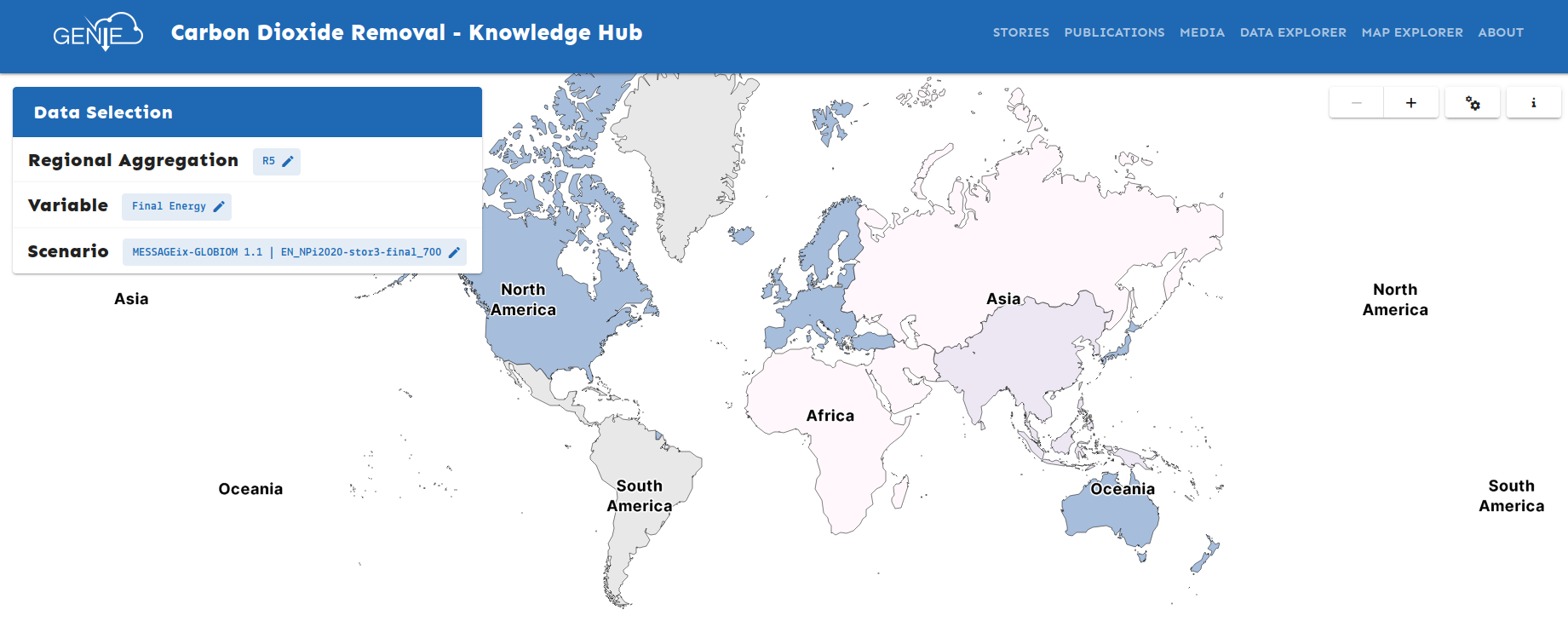 Dear GENIE colleagues, I would like to share an update on some of the new features that the Scenario Services team at IIASA has recently implemented in the Scenario Explorer front-end, which are now also available in the CDR Knowledge hub. As shared last year we added a data explorer to the CDR Knowledge hub to visualize the scenarios data. [cid:6550682a-1dad-428a-8a62-7c3dec901e7e] We now support native model regions and have added a map explorer to visualize the time-series data on a map. Below is an example of the R5 regions visualized. [cid:1128aaa3-b5a7-45cb-bfec-d4e370b04d47] In addition, the chart legend and mouse-over information in the data explorer plots have been made more user-friendly. You can now choose between multiple stacking options, customize colors, and use a highlight-dataset feature to easily identify specific time series. [cid:ec59f508-9a88-48ba-b4c8-d2c4524d42da] Please feel free to share any comments or suggestions for further improvements. Best regards, Lisah